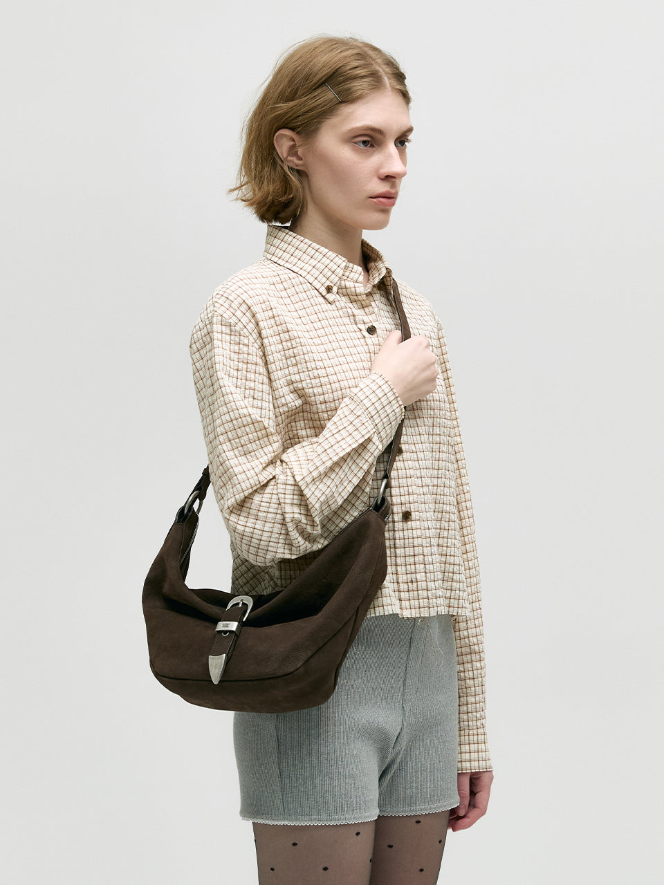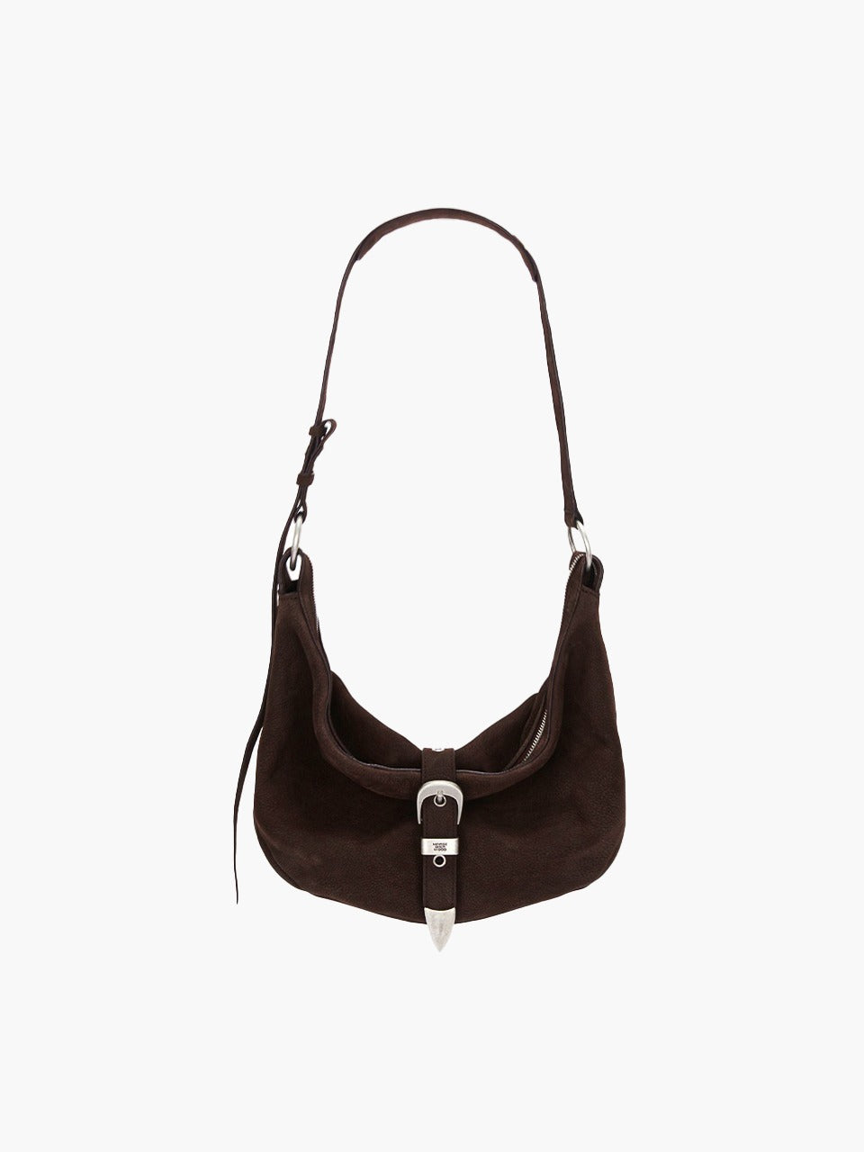 - Midium sized slouchy hobo bag featuring belted strap with Margesherwood logo engraved metal buckle and keeper loop