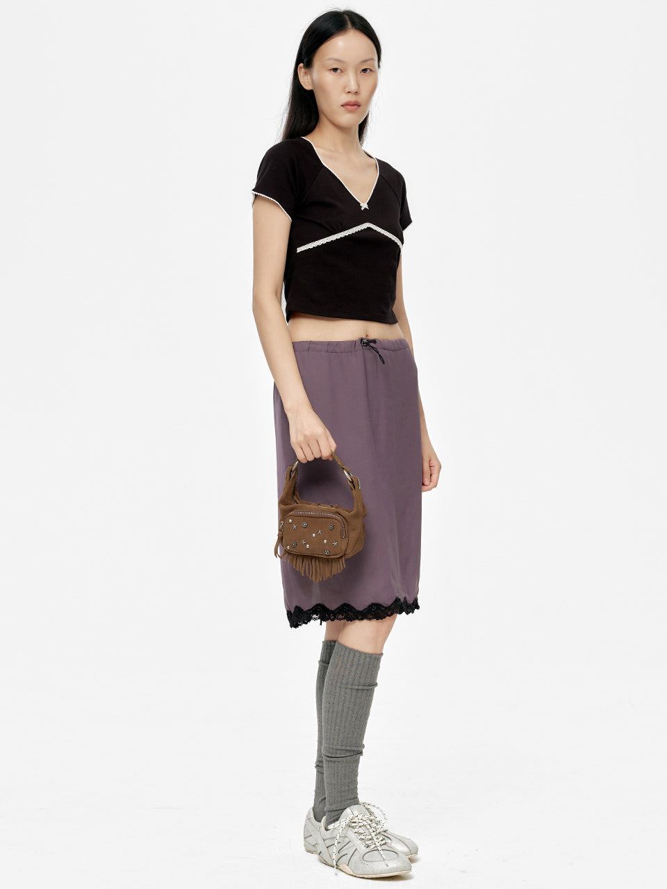 · Front pocket with 3 different shapes of studs and a fringe detail