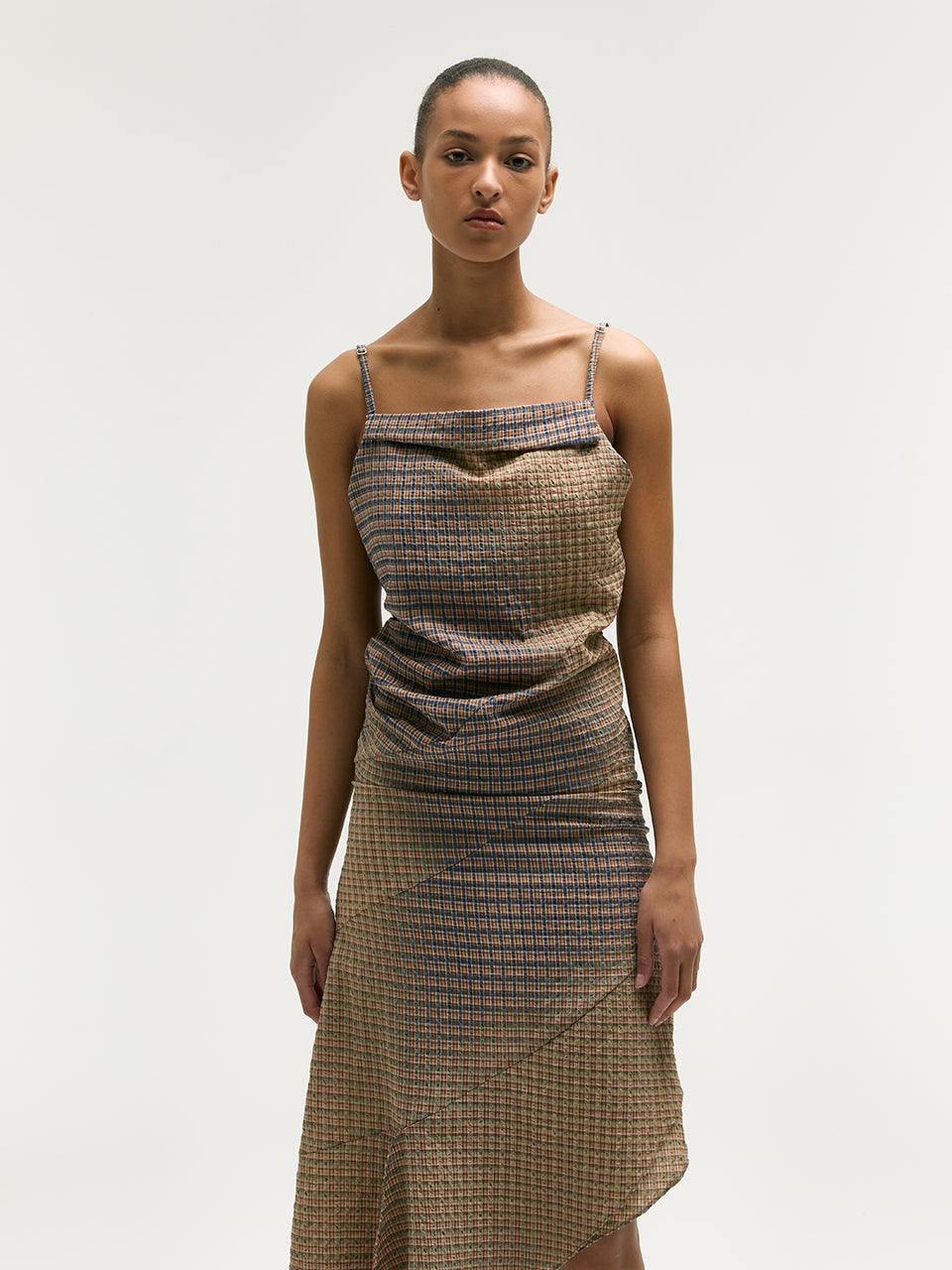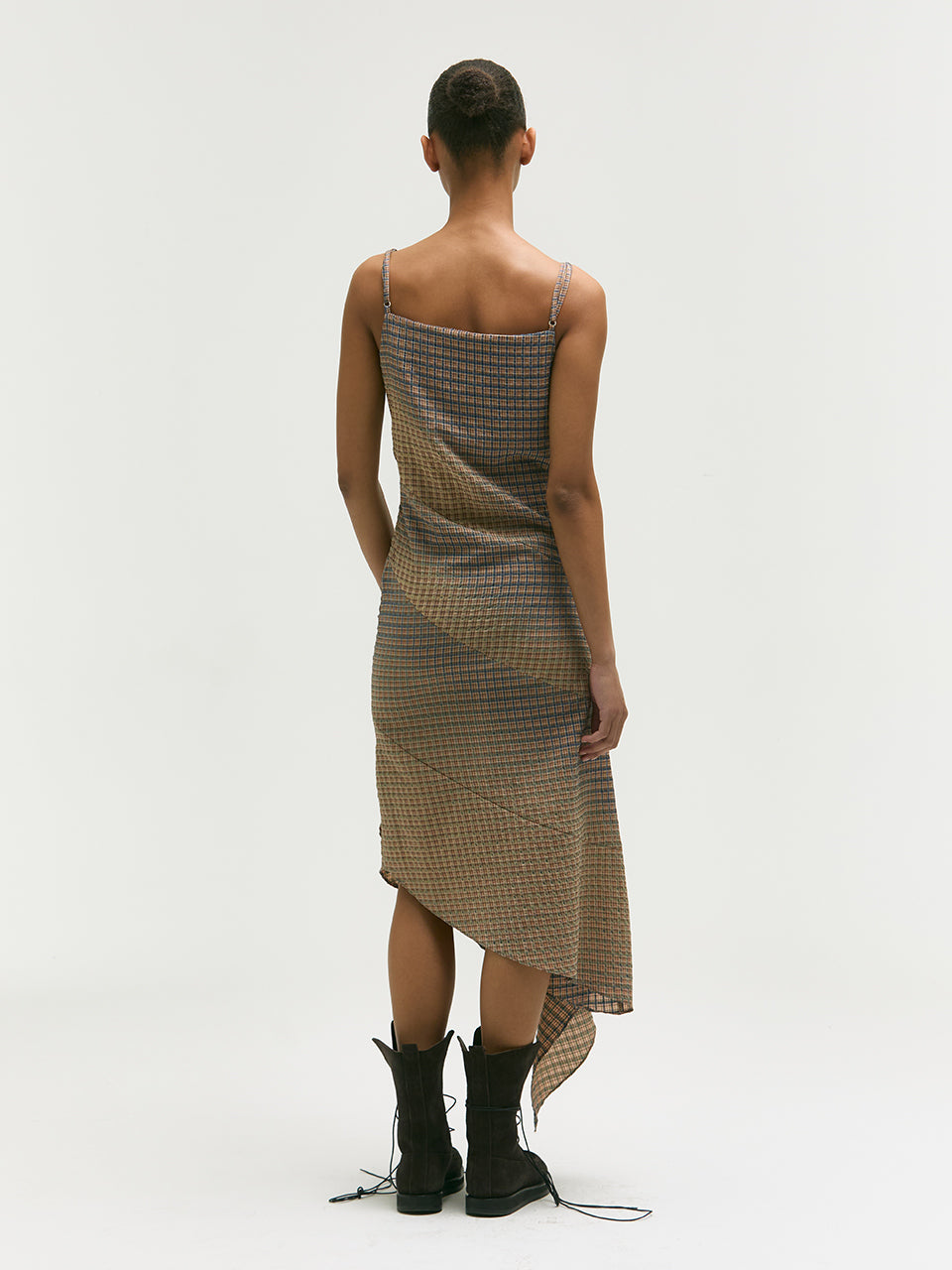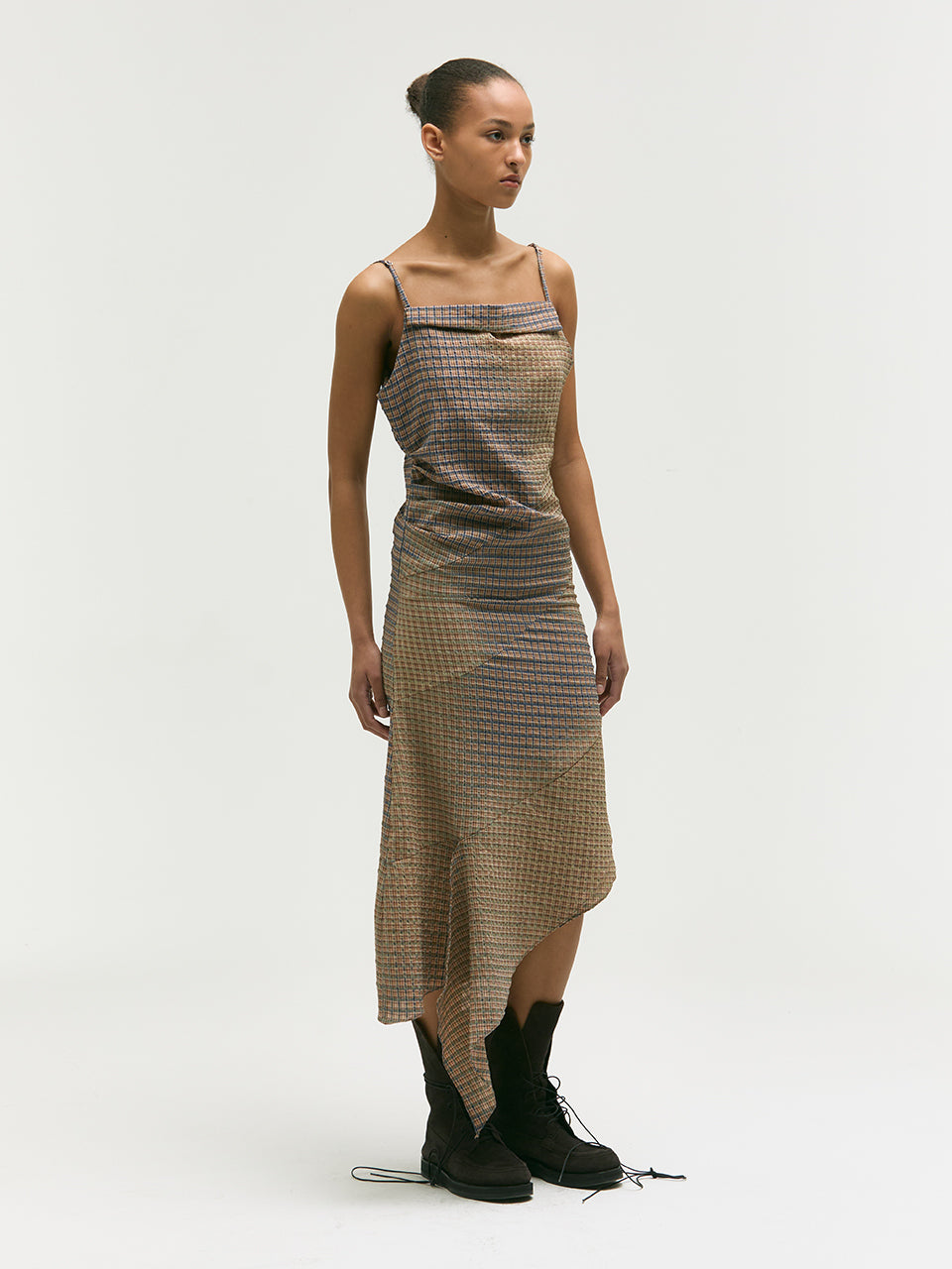 - Asymmetrical hemline with naturally flowing edges, diagonal seams, and subtle tucks at the waist for a natural draped silhouette