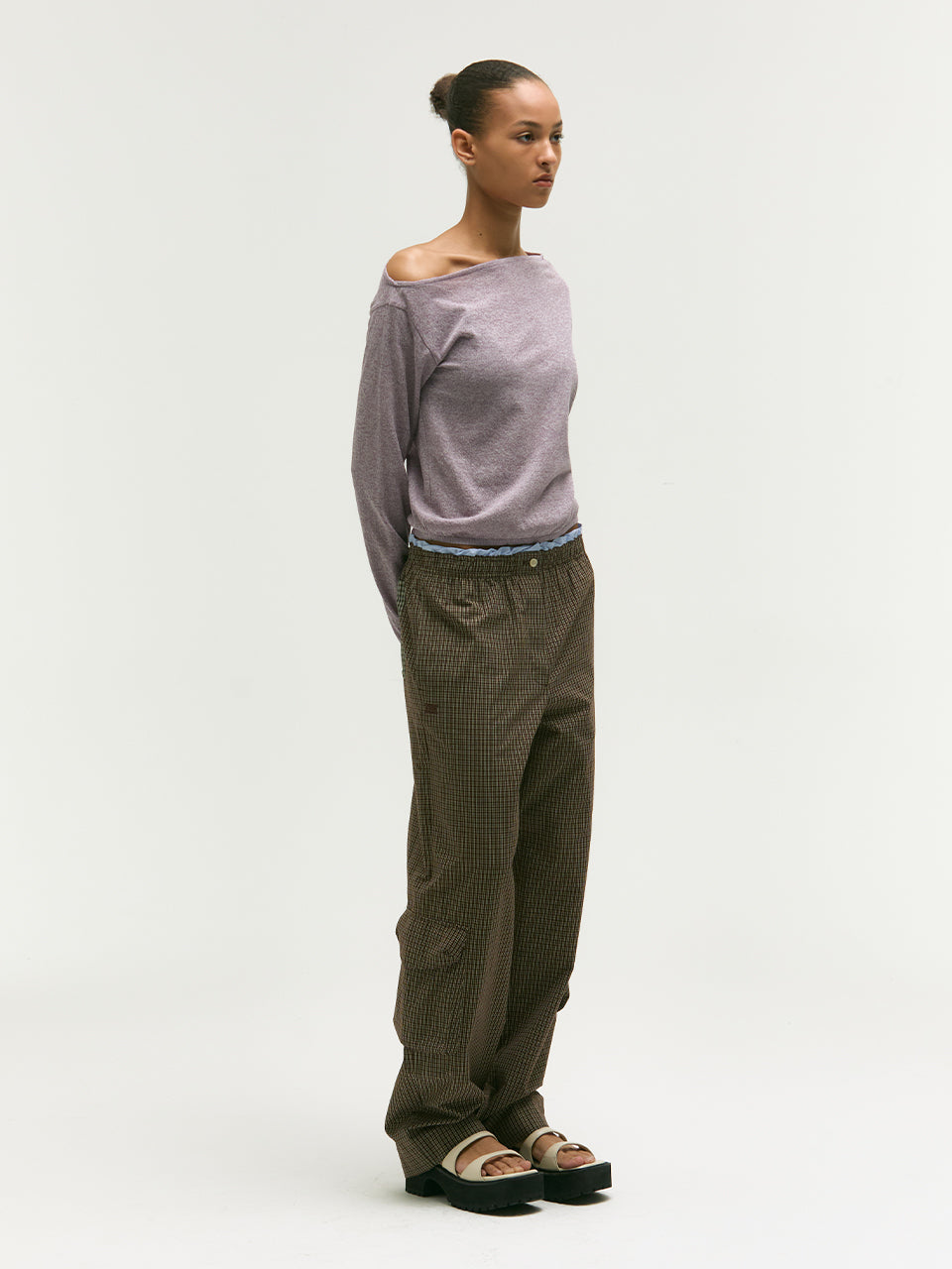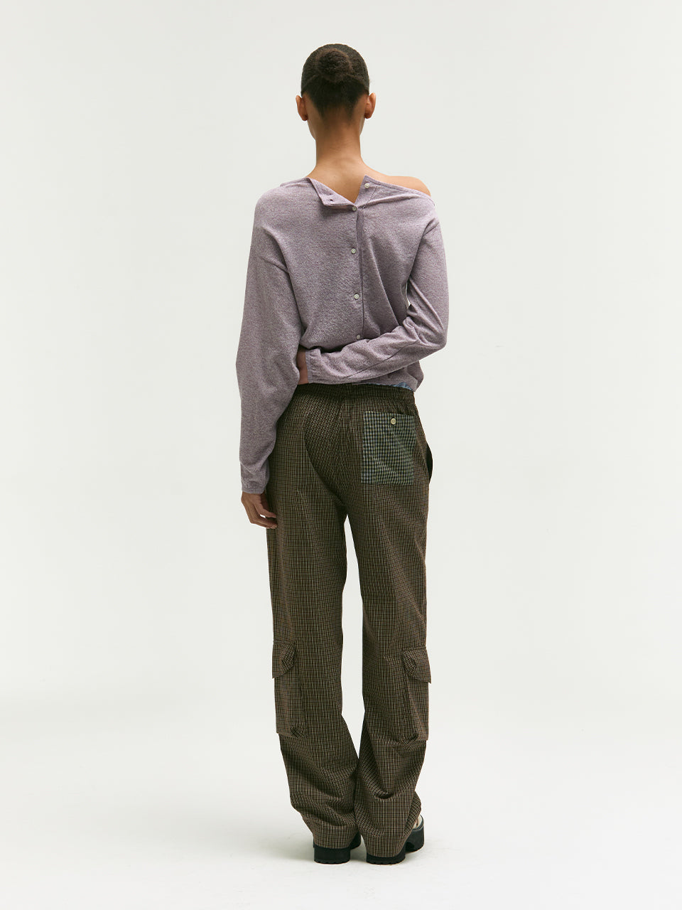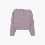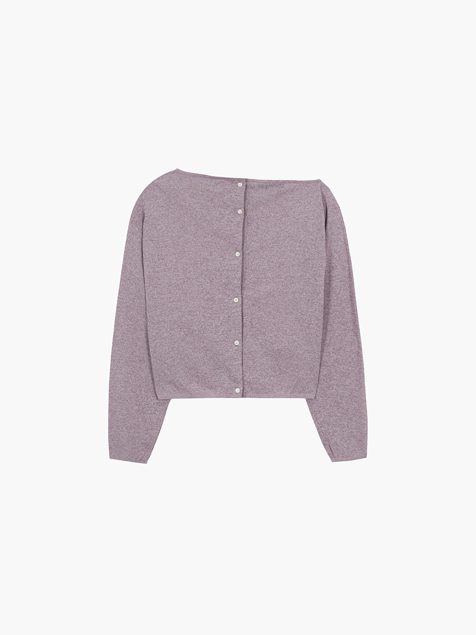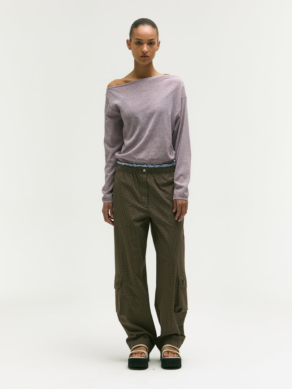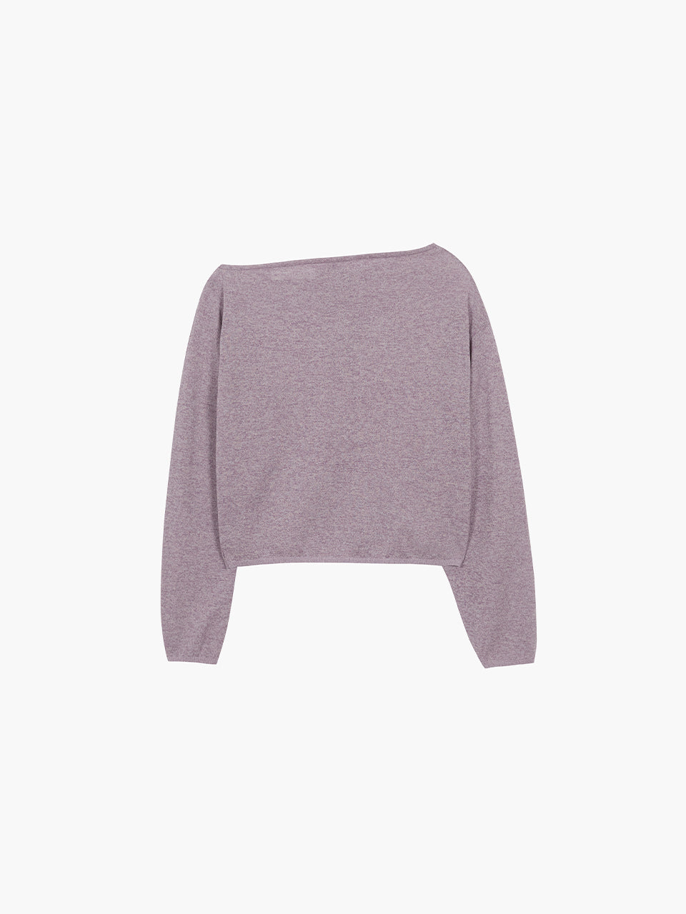 - Unbalanced off-shoulder knit with a casual yet feminine mood