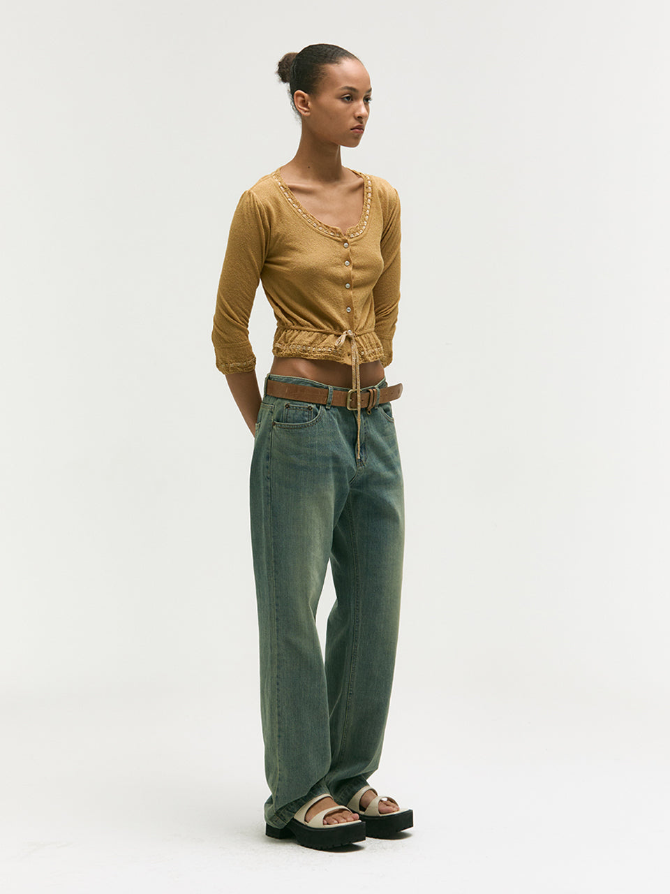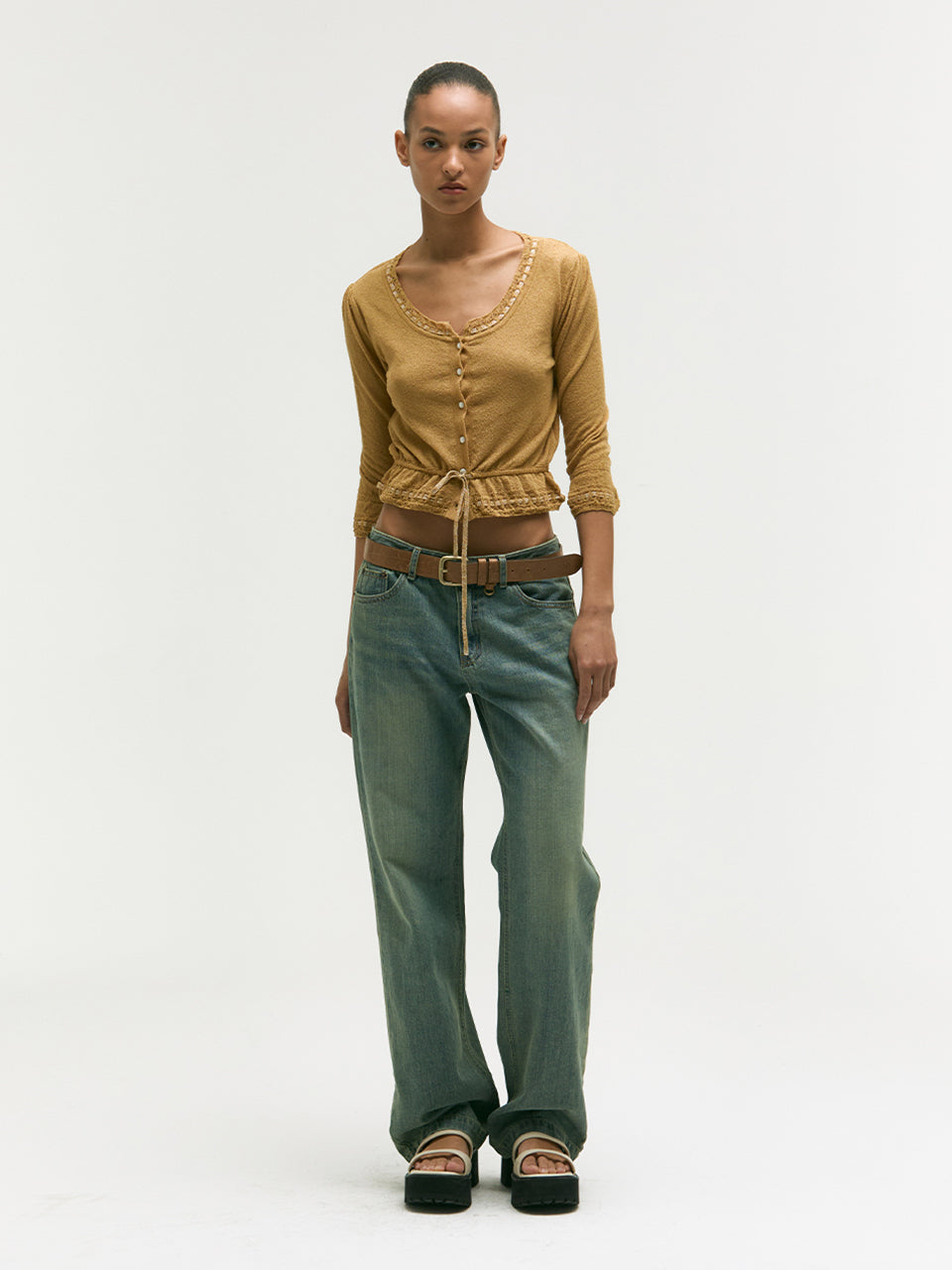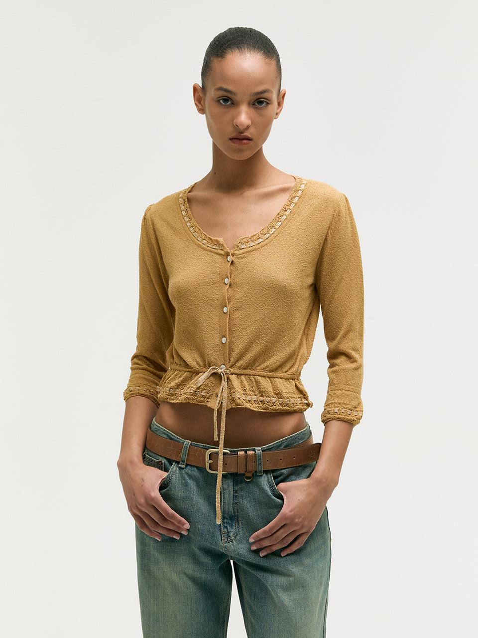 - Features a feminine and retro vibe with 3/4 sleeves and a cropped length