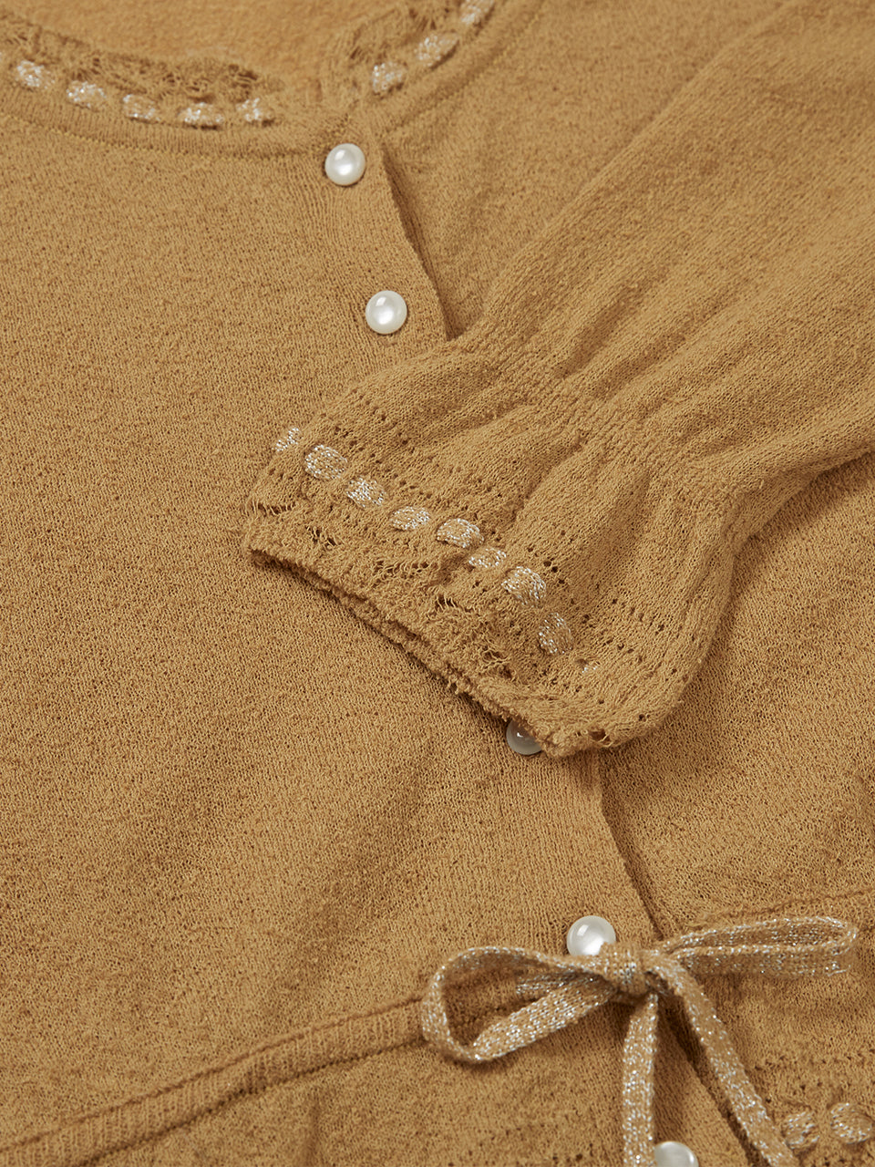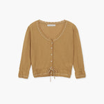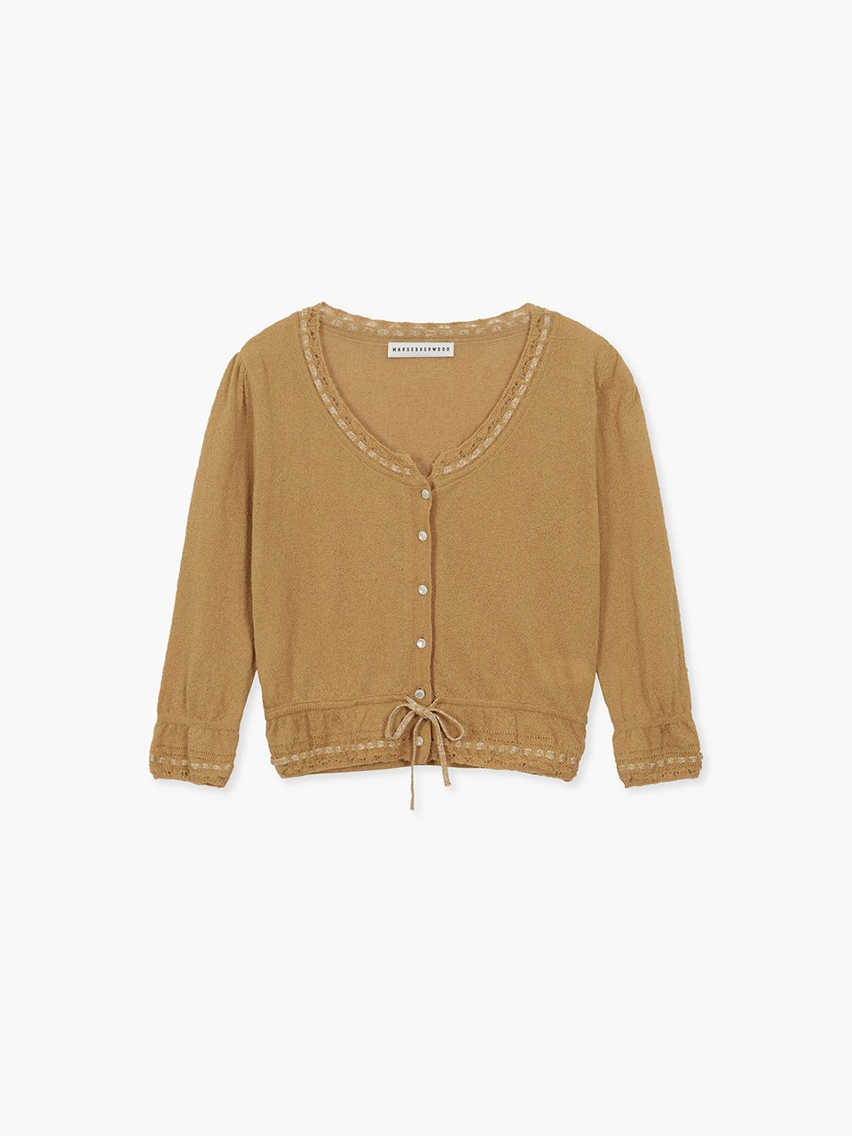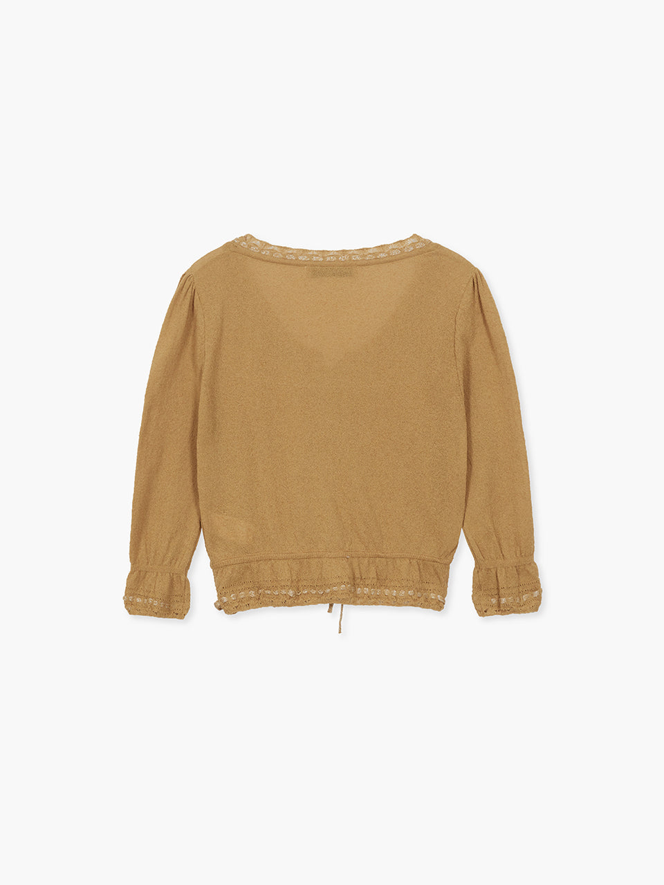 - Features a feminine and retro vibe with 3/4 sleeves and a cropped length