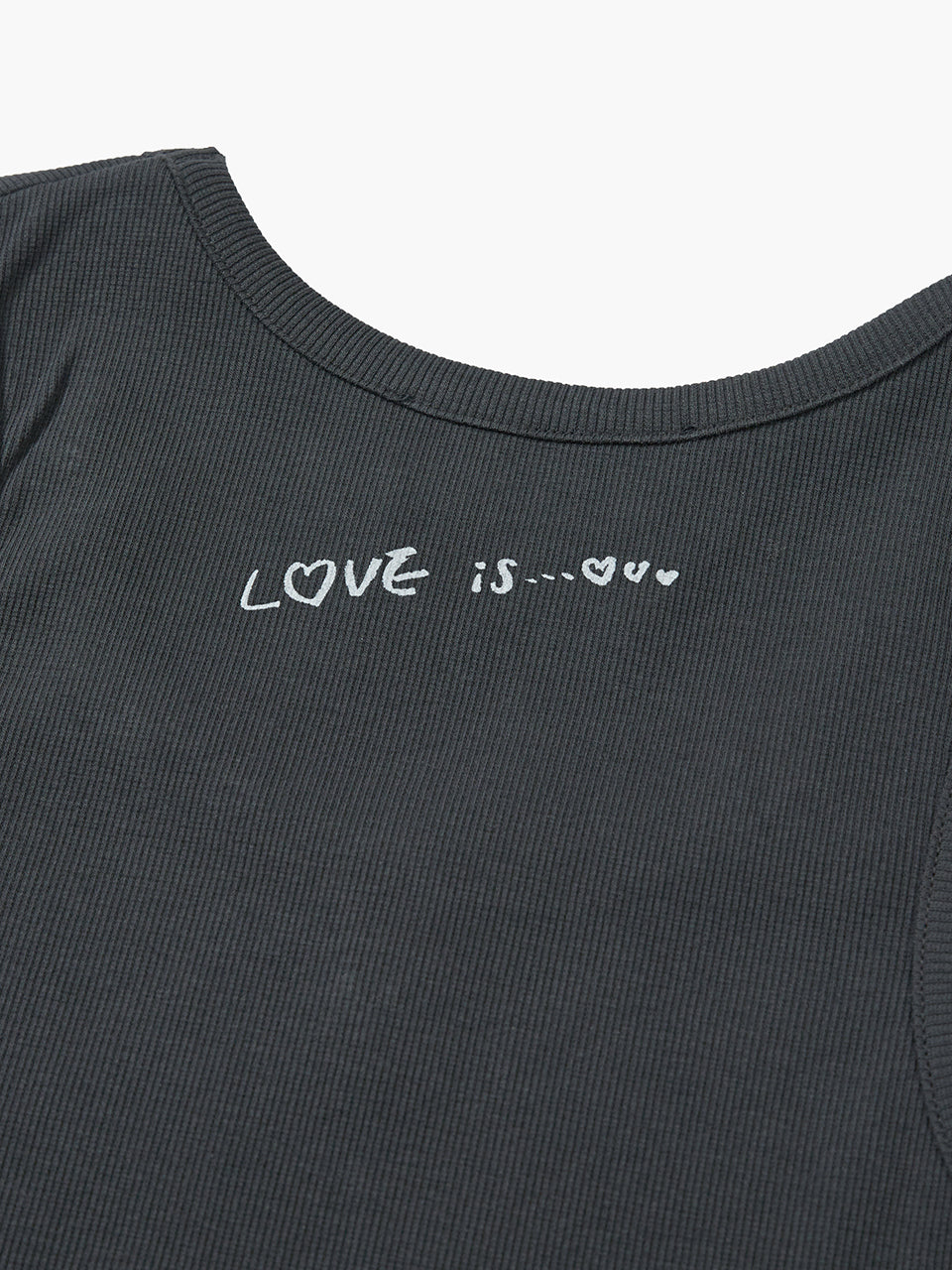 . Back panel features LOVE IS lettering and a heart print detail