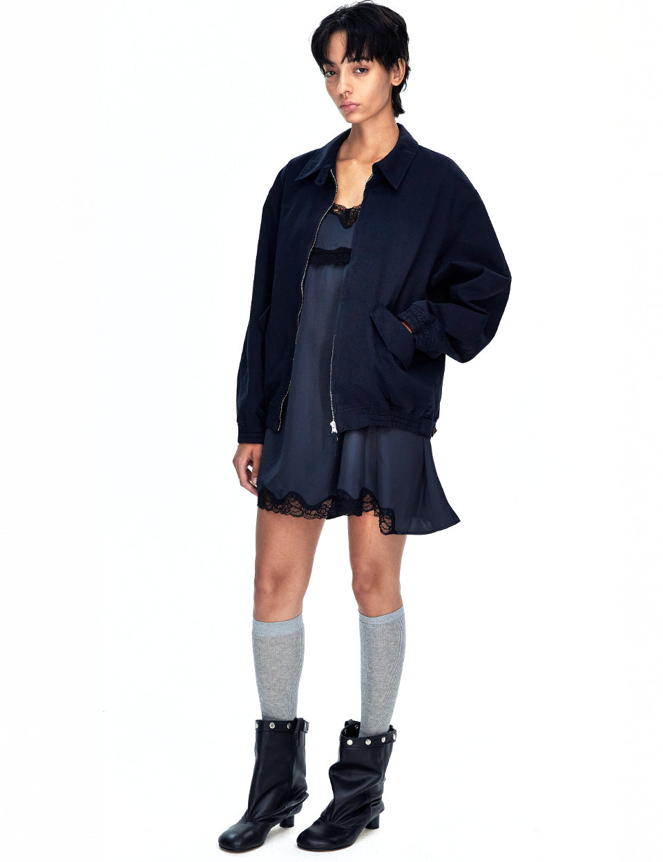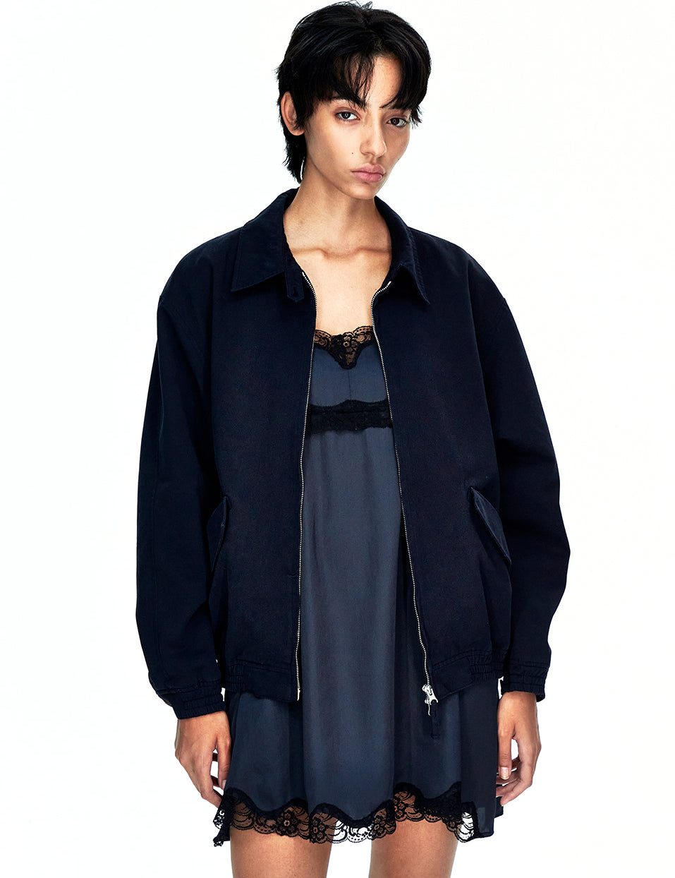WASHED ZIP-UP BOMBER JACKET_navy