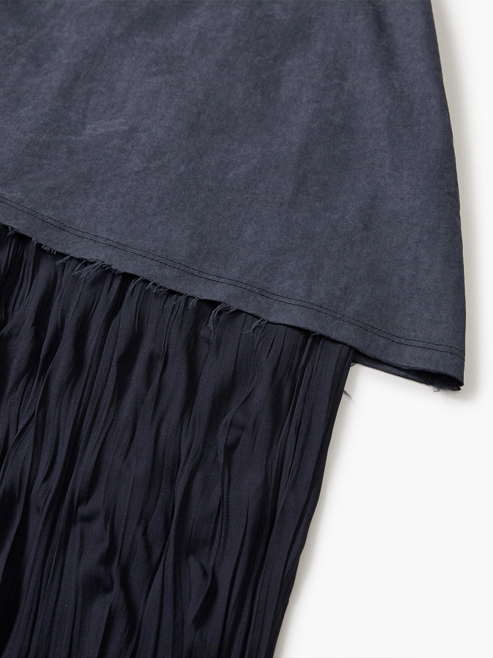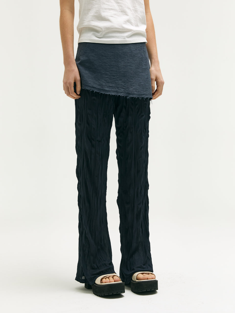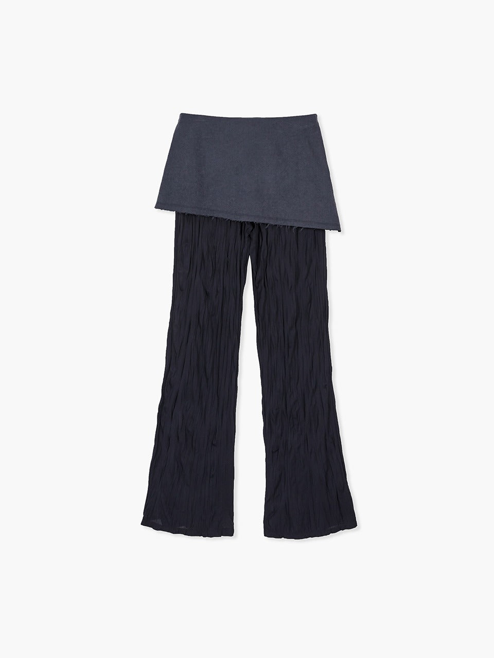 - A layered piece combining a matte, soft cupra skirt with loosely pleated pants for a playful contrast in texture