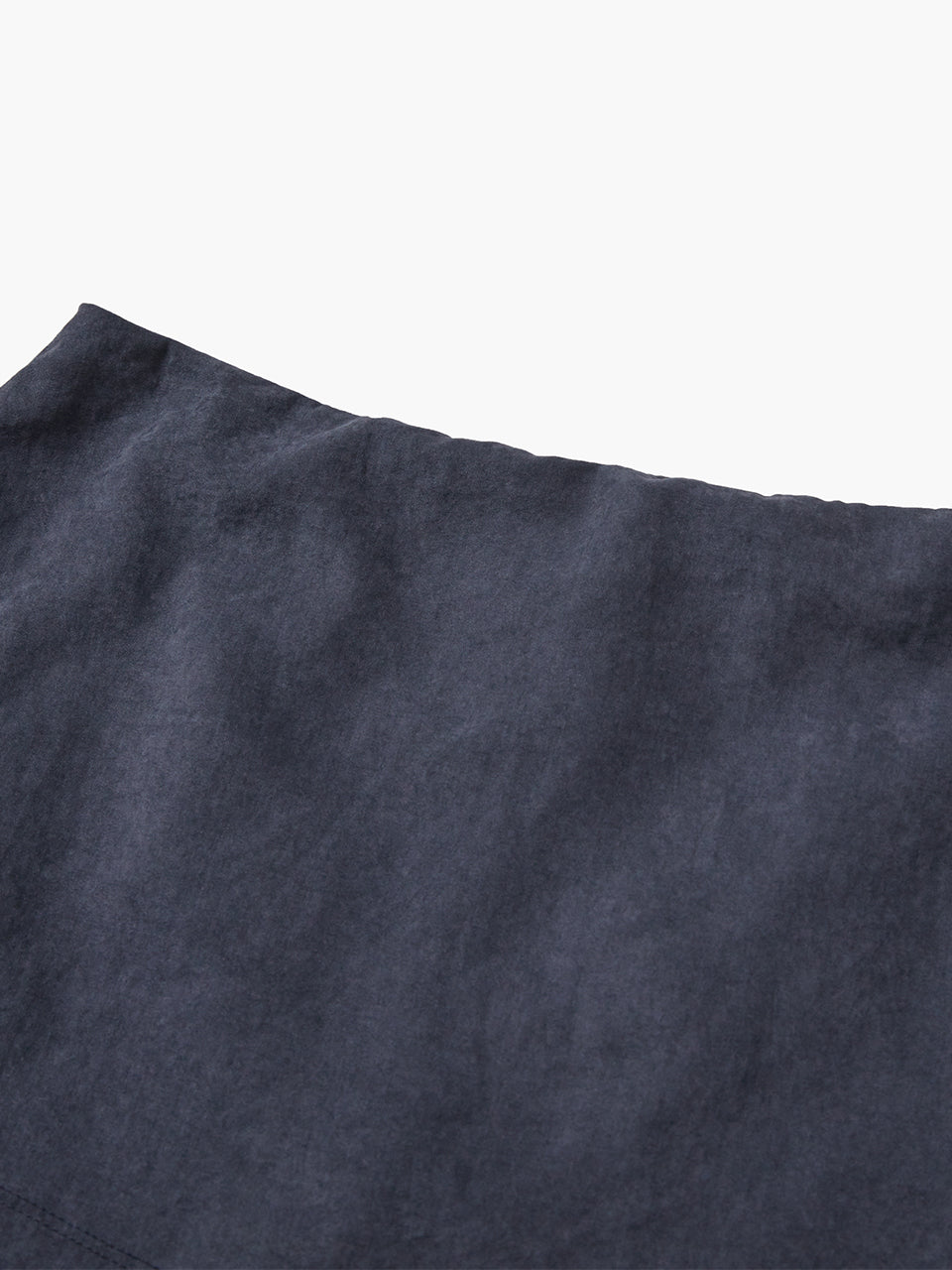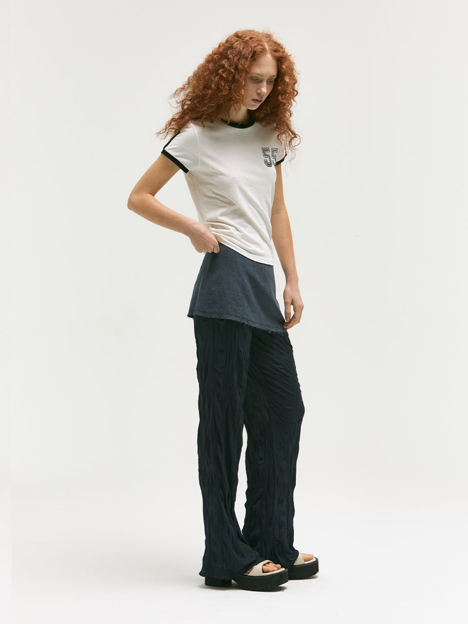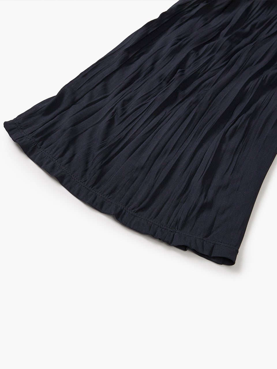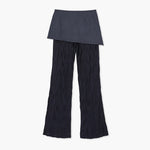 - A layered piece combining a matte, soft cupra skirt with loosely pleated pants for a playful contrast in texture