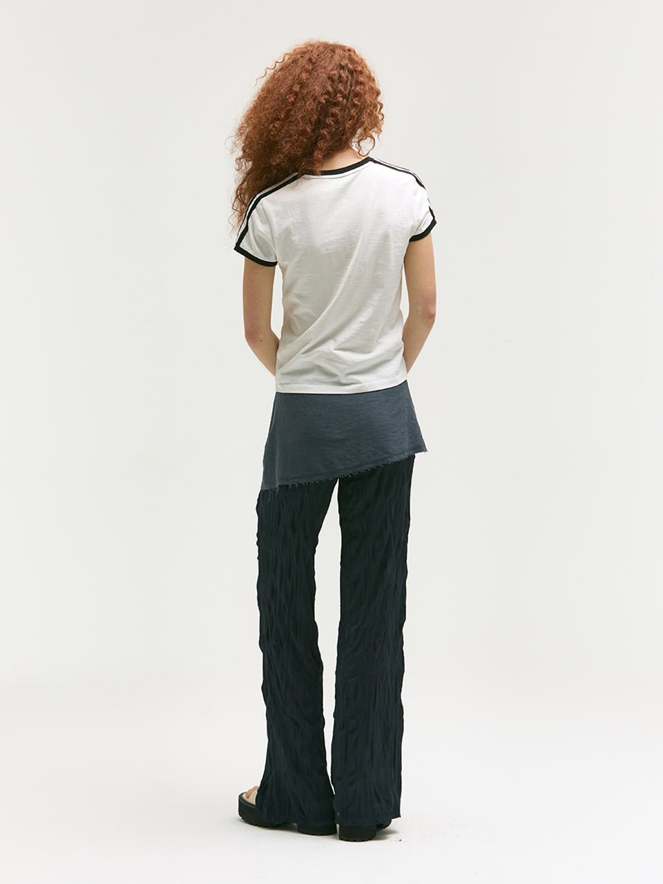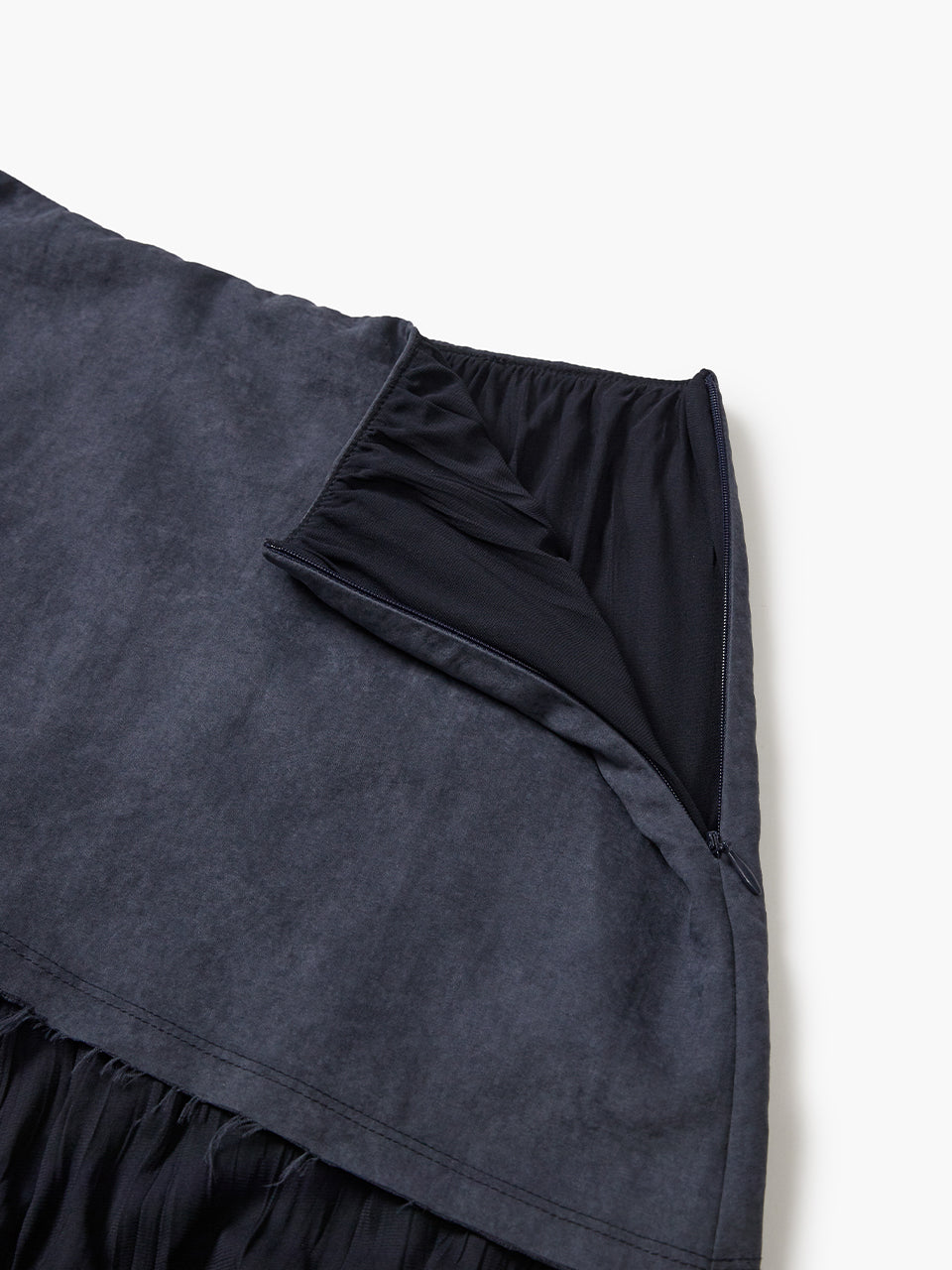 - Diagonal hem variation and raw-cut detailing on the skirt add a unique design touch