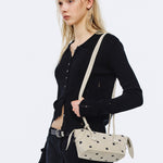 · A small shopper bag with a transformable shape by folding the top side panels.