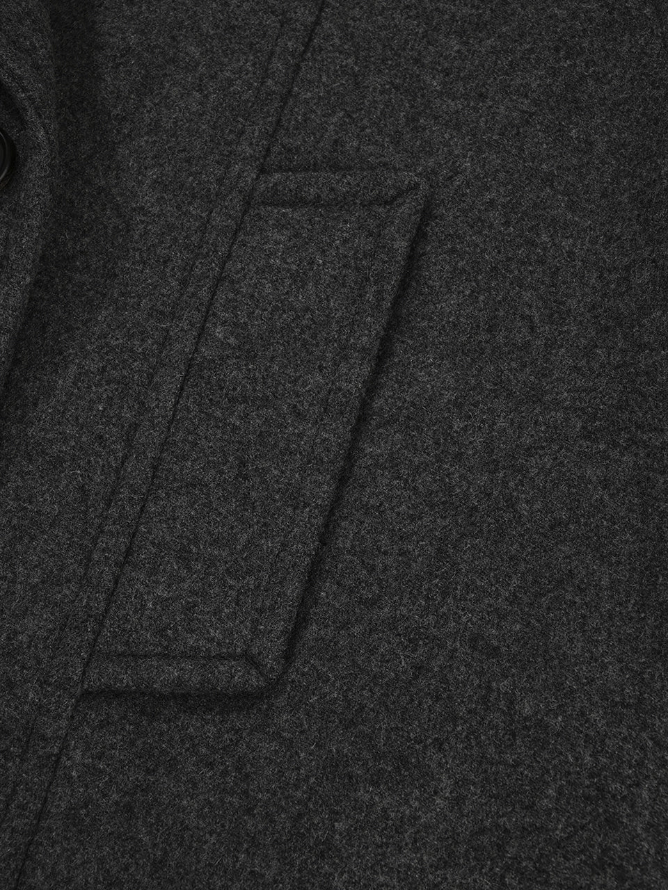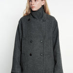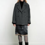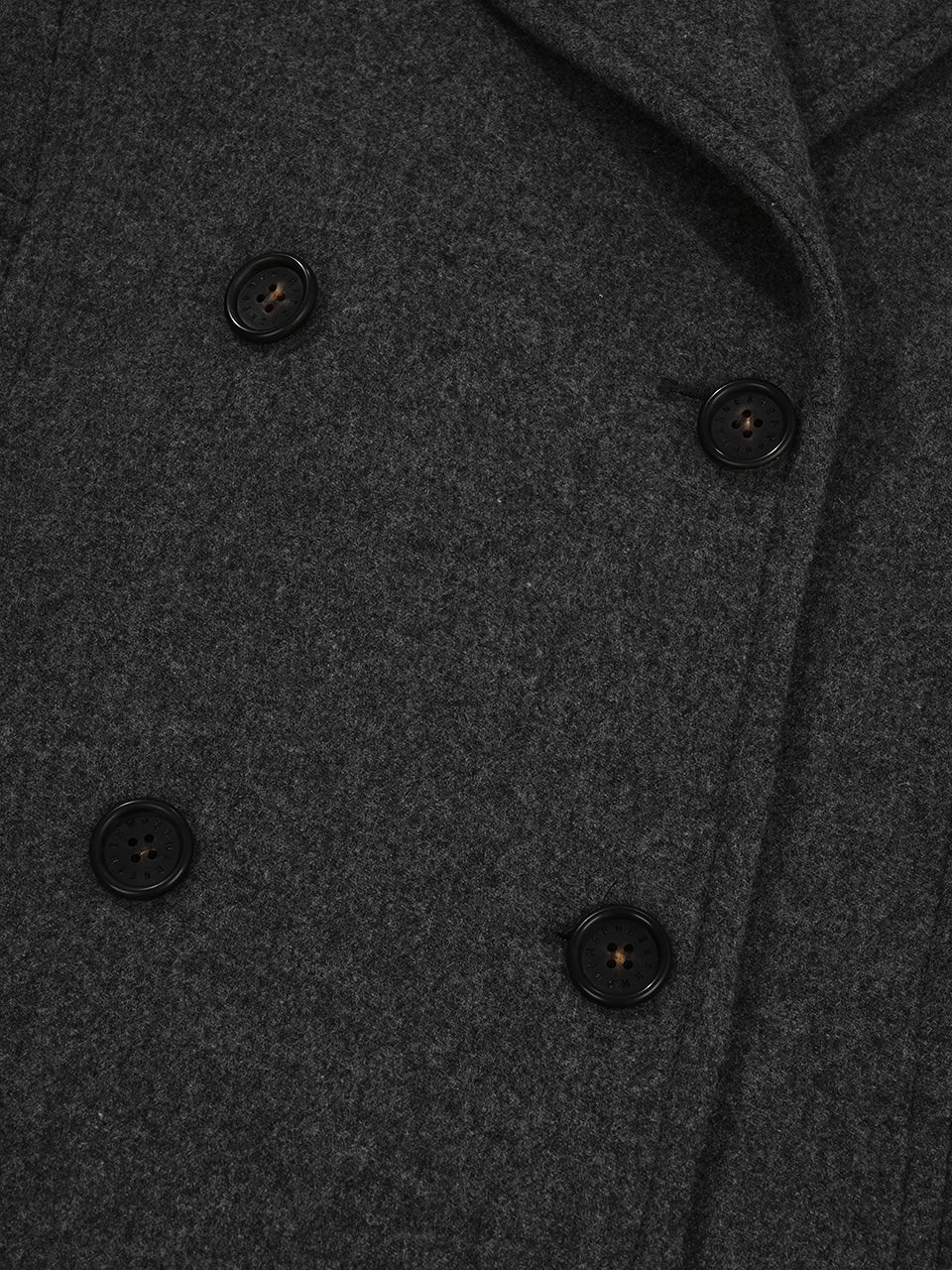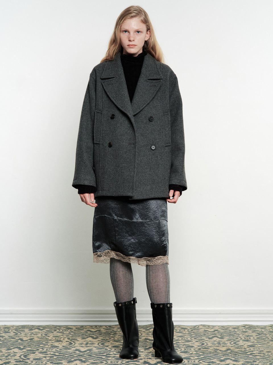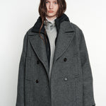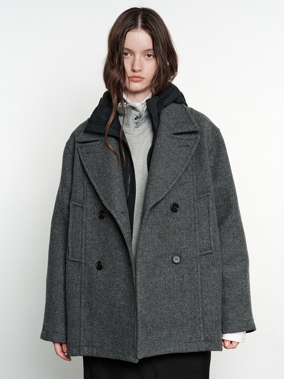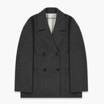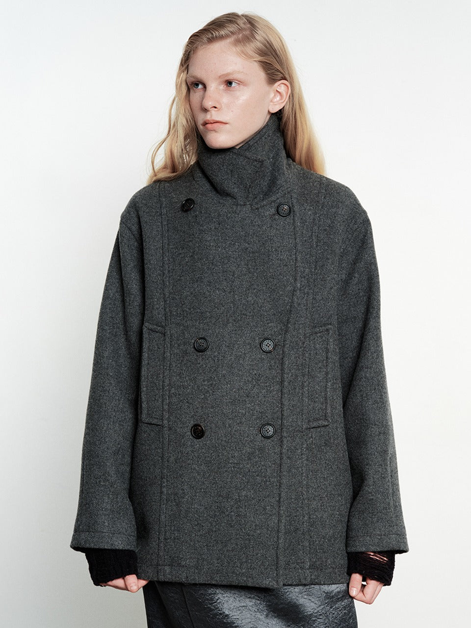 A double-breasted pea coat crafted from a high-density wool blend. Designed with an oversized silhouette and a hip-covering half length for a relaxed fit. The brushed cotton lining adds extra warmth and comfort.