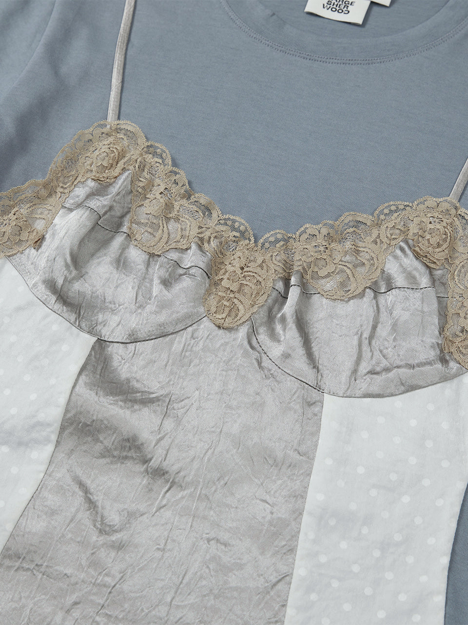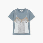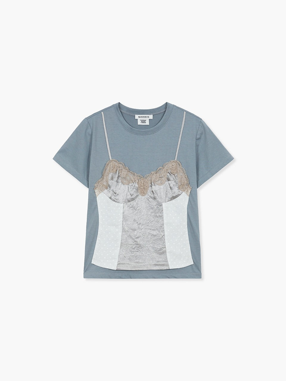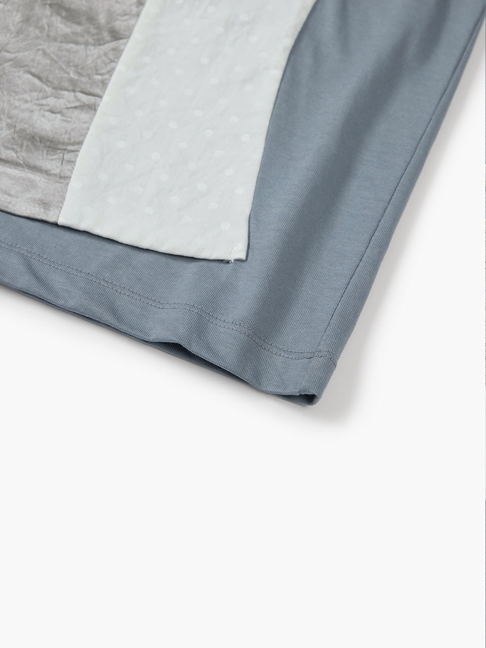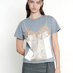 This regular-fit short-sleeve T-shirt features a camisole attached to the front panel for a layered look. The contrast of wrinkled satin and dotted velvet satin adds texture, while the silk-processed jersey fabric ensures a soft yet structured feel.