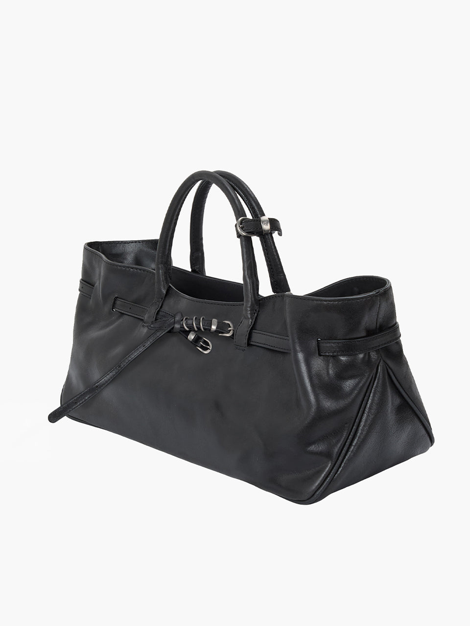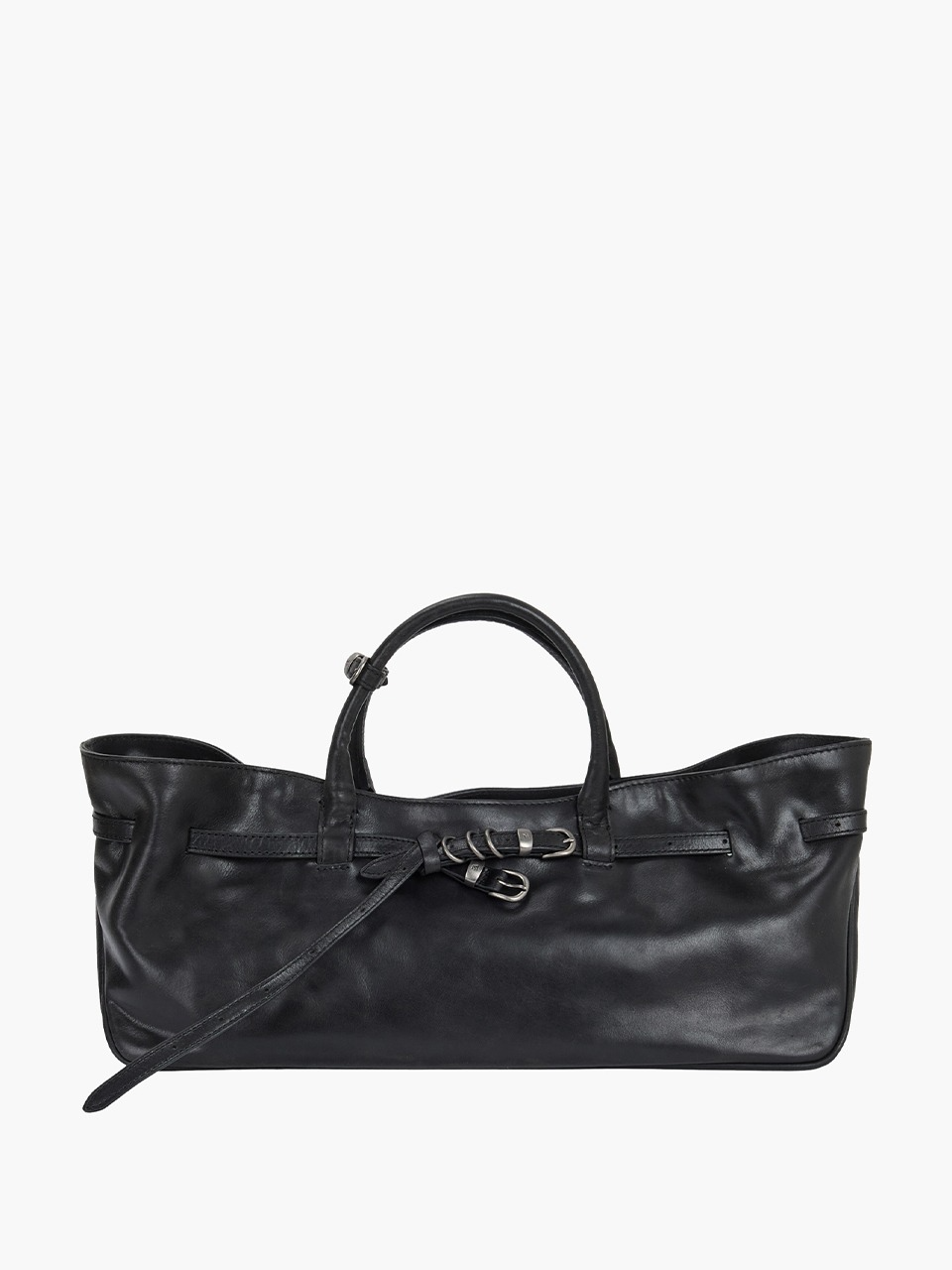 · A baguette-shaped bag featuring a knotted belt strap