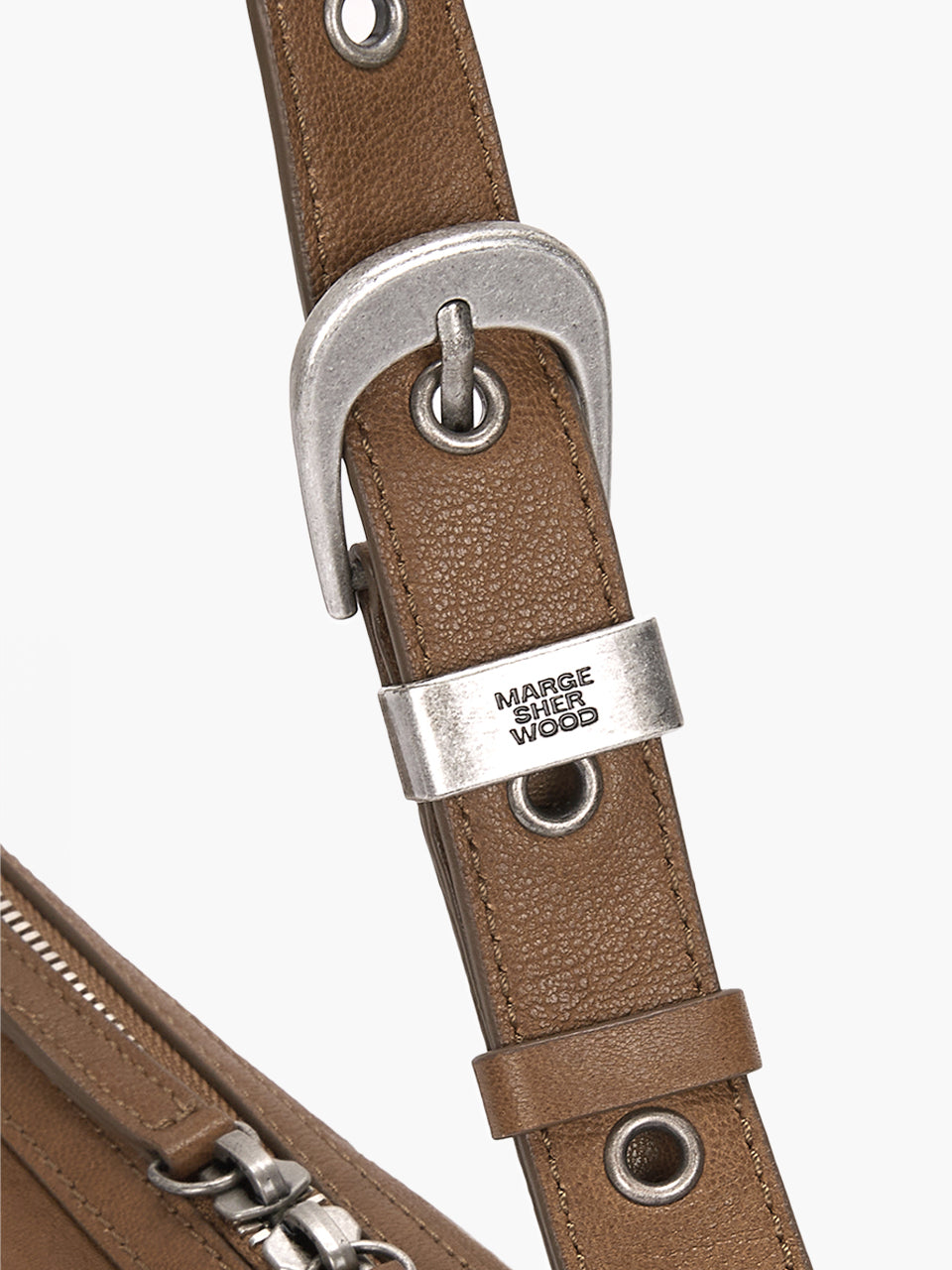 - Adjustable strap with metal buckle, Margesherwood logo engraved keeper loop and eyelets